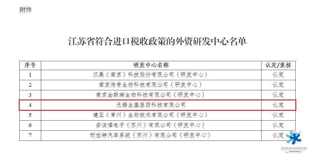 12月14日,江蘇省商務廳、江蘇省財政廳、南京海關和江蘇省稅務局聯合發布2022年第二批符合進口稅收政策的外資研發中心名單,全省共7家企業新獲認定,無錫生基醫藥科技有限公司為本次無錫唯一一家。至此,無錫共有10家外資研發中心新獲認定或通過復核,其中惠山區兩家—保諾生物與生基醫藥,均為惠山經開區生命園企業。