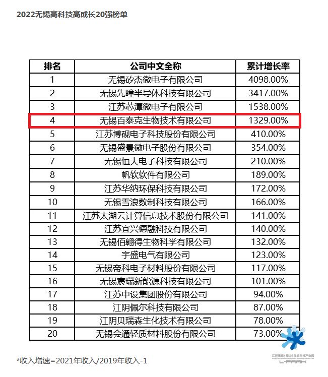 2023年4月3日,由無錫經(jīng)濟(jì)開發(fā)區(qū)與德勤中國聯(lián)合主辦,無錫雪浪小鎮(zhèn)未來園區(qū)協(xié)辦,“2022德勤無錫高科技高成長20強(qiáng)及明日之星”頒獎(jiǎng)典禮在君來世尊酒店隆重舉行,榮獲20強(qiáng)和明日之星的35家企業(yè)負(fù)責(zé)人出席接受授獎(jiǎng)。惠山生命園一舉囊括頒獎(jiǎng)項(xiàng)目的1/7,其中百泰克生物上榜2022無錫高科技高成長20強(qiáng),位列第4,高峰醫(yī)療、海萊新創(chuàng)、麥默真空和帕母醫(yī)療同時(shí)入選明日之星。