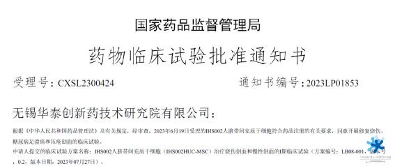 9月18日,無錫華泰創(chuàng)新藥技術(shù)研究院具有自主知識產(chǎn)權(quán)的Ⅰ類新藥——“IHS002人臍帶間充質(zhì)干細(xì)胞”(受理號CXSL2300424)正式獲得國家藥品監(jiān)督管理局的臨床試驗(yàn)?zāi)驹S可,用于修復(fù)燒傷、糖尿病足潰瘍和壓瘡創(chuàng)面進(jìn)入I期臨床。據(jù)悉,此次IND申請獲批是無錫首張臍帶來源間充質(zhì)干細(xì)胞I類新藥臨床批件,對無錫創(chuàng)新藥物研發(fā)進(jìn)程具有里程碑式重要意義。