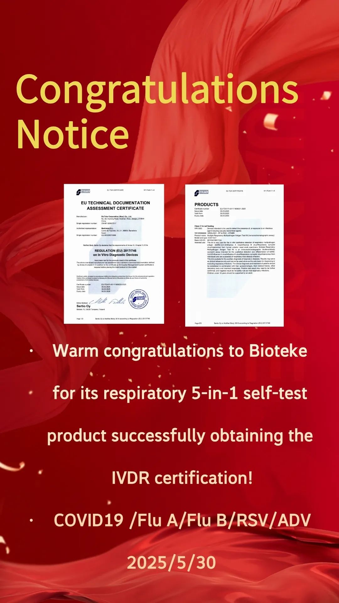 - 熱烈祝賀百泰克呼吸道五聯檢自測產品成功獲得IVDR認證
